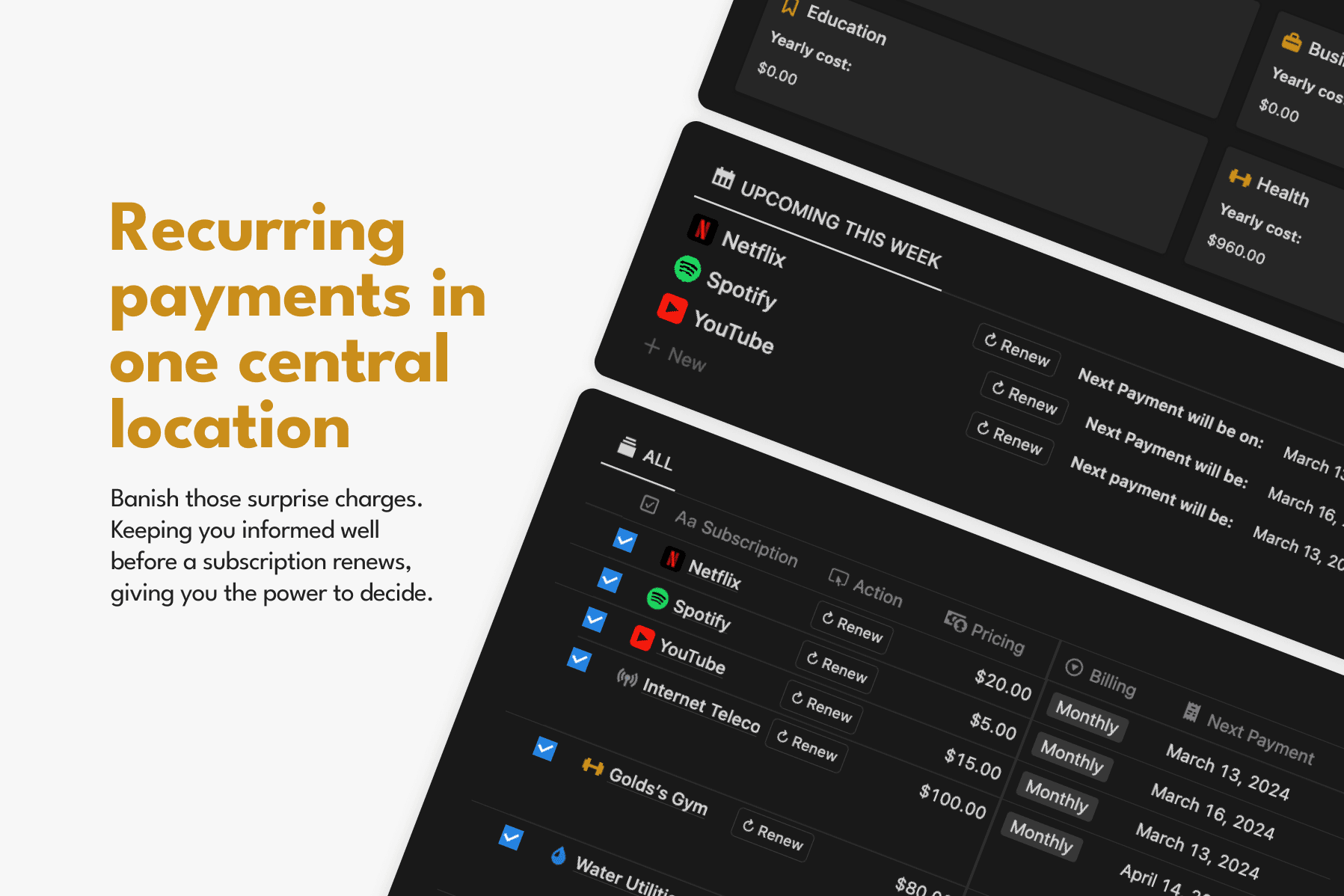 Effortlessly Track Everything: Manage subscriptions, bills, and recurring payments in one central location.